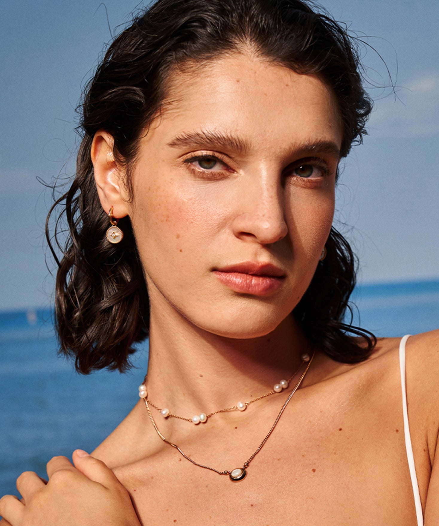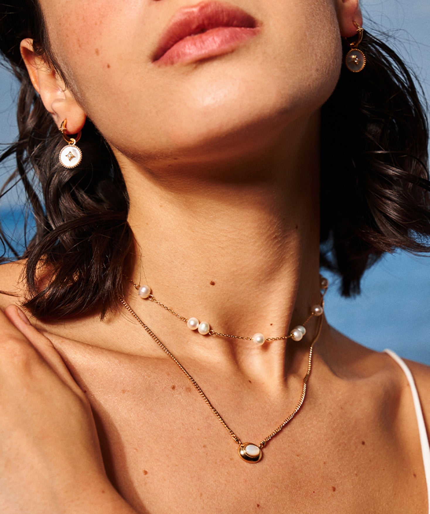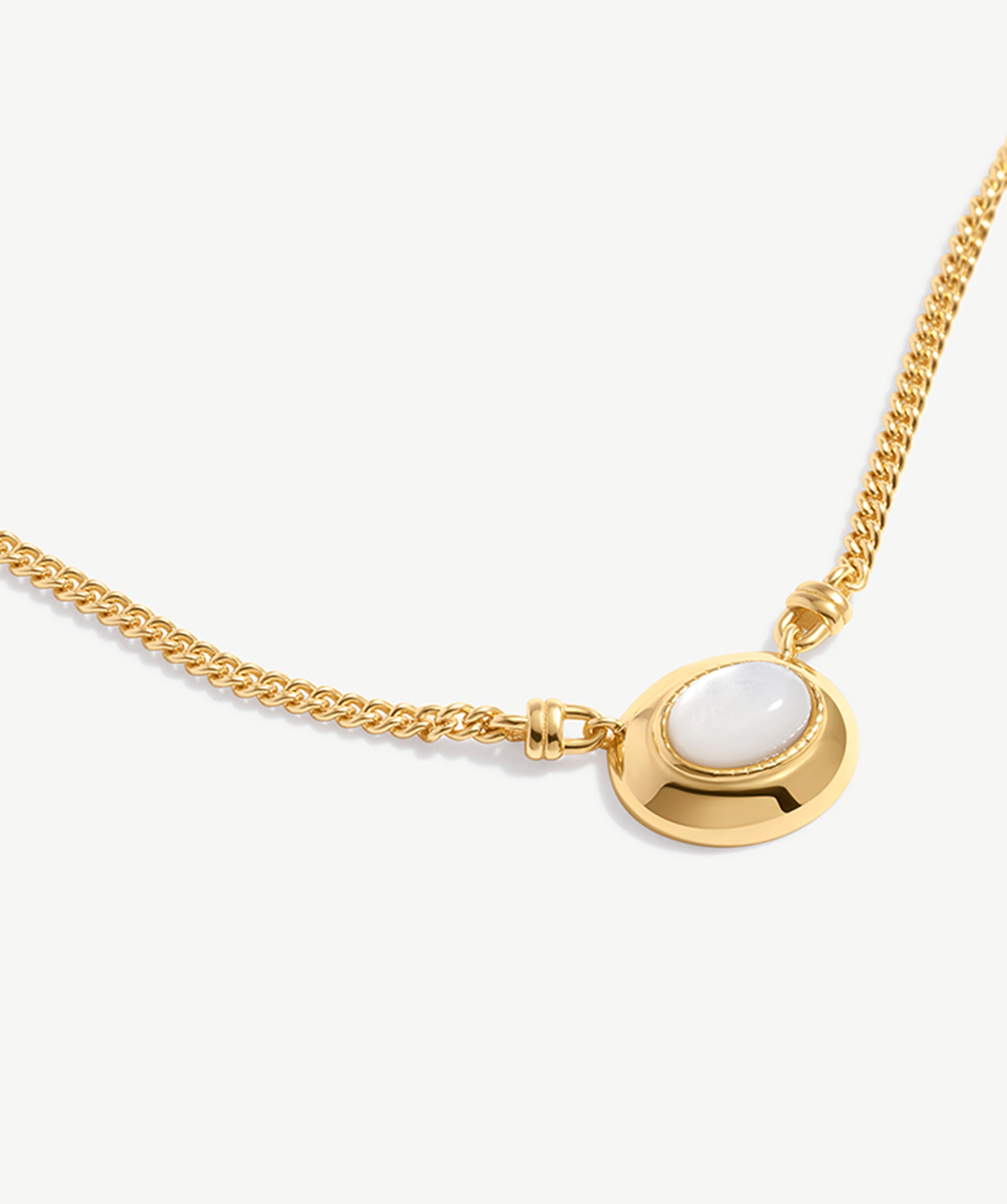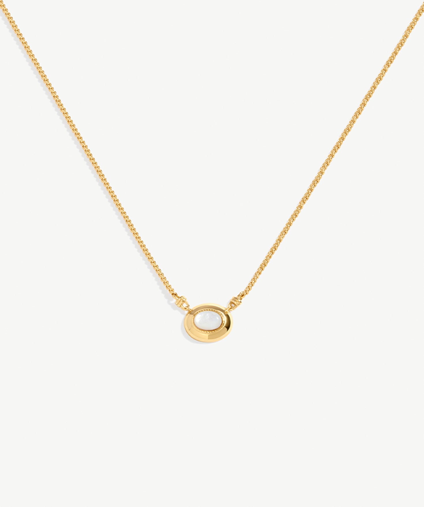 Inspired by the serene beauty of the moon, this necklace features a delicate mother of pearl set in a sleek gold pendant. The mother of pearl symbolizes calm and purity, while the 18K gold plating adds a touch of luxury. This piece is perfect for adding a subtle elegance to any outfit, whether for everyday wear or special occasions.