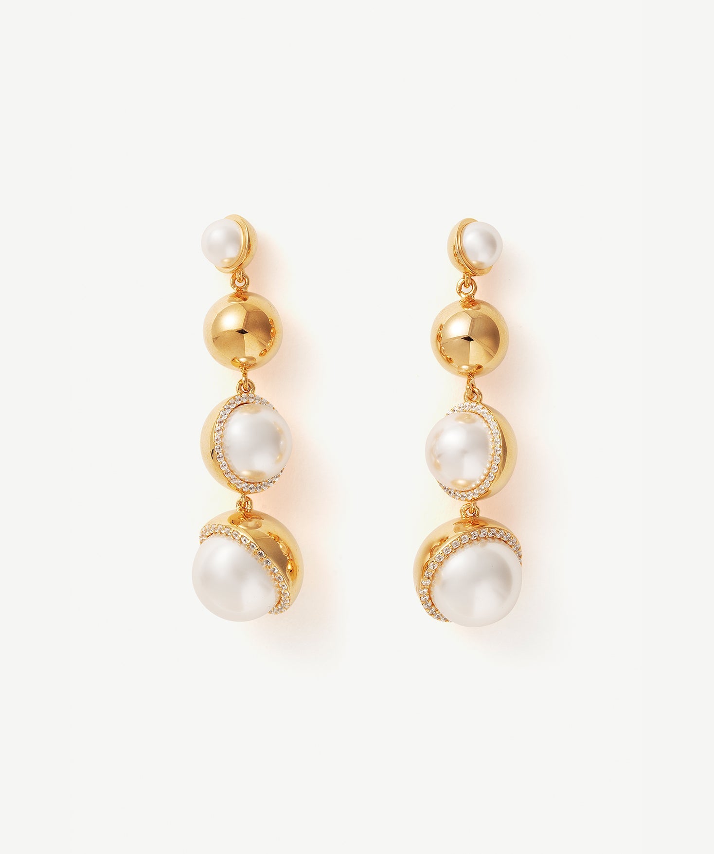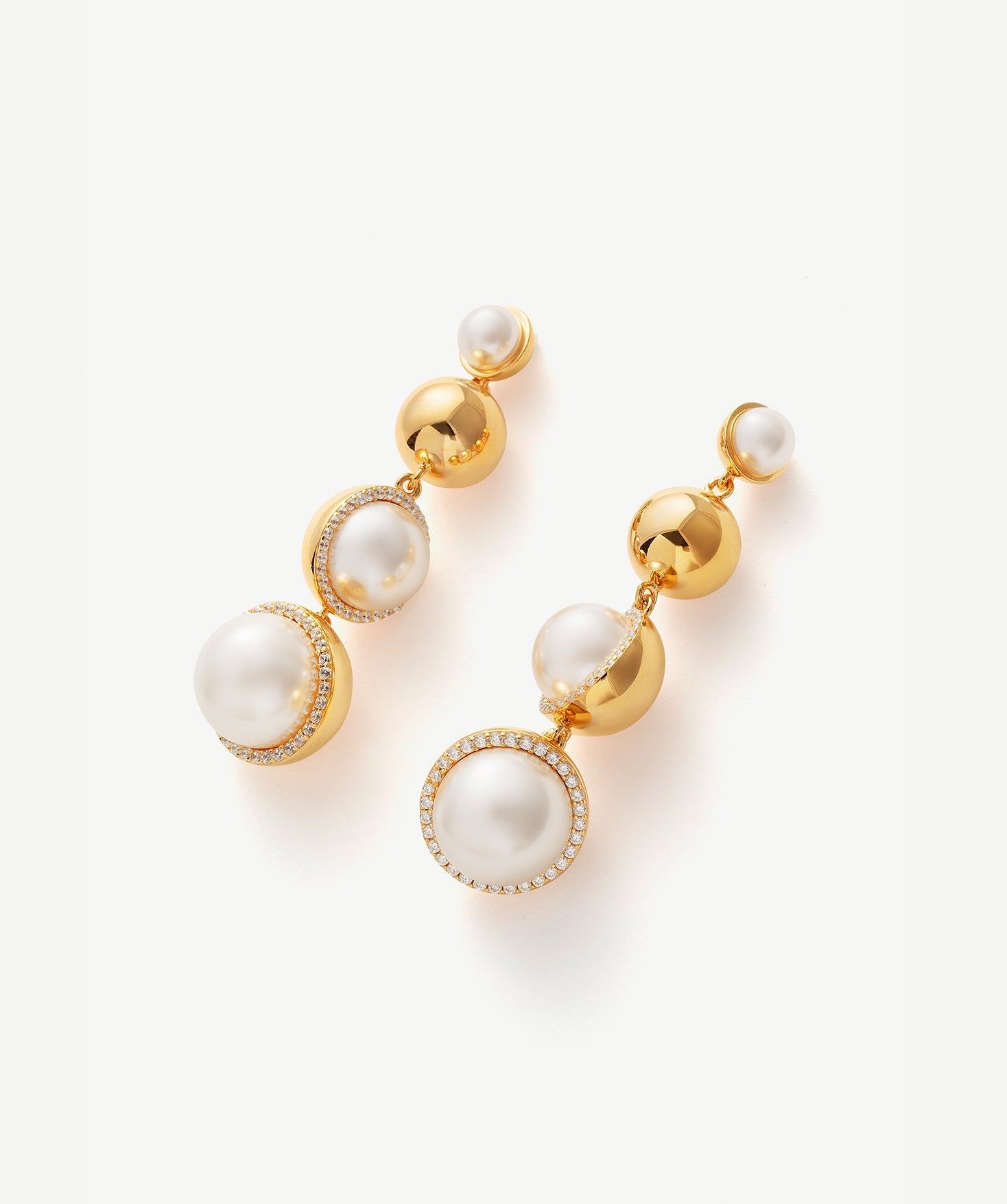Dancing with every step, these earrings mirror the phases of the moon—sharp as the crescent, soft as the full moon. The graduated pearls and golden accents embody clarity and romanticism, forged into one striking silhouette. Designed to echo your presence, elegantly and boldly.