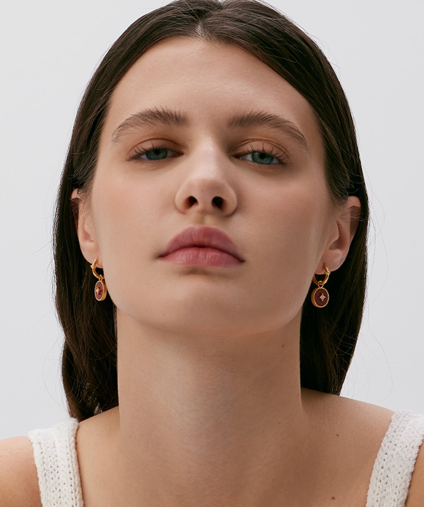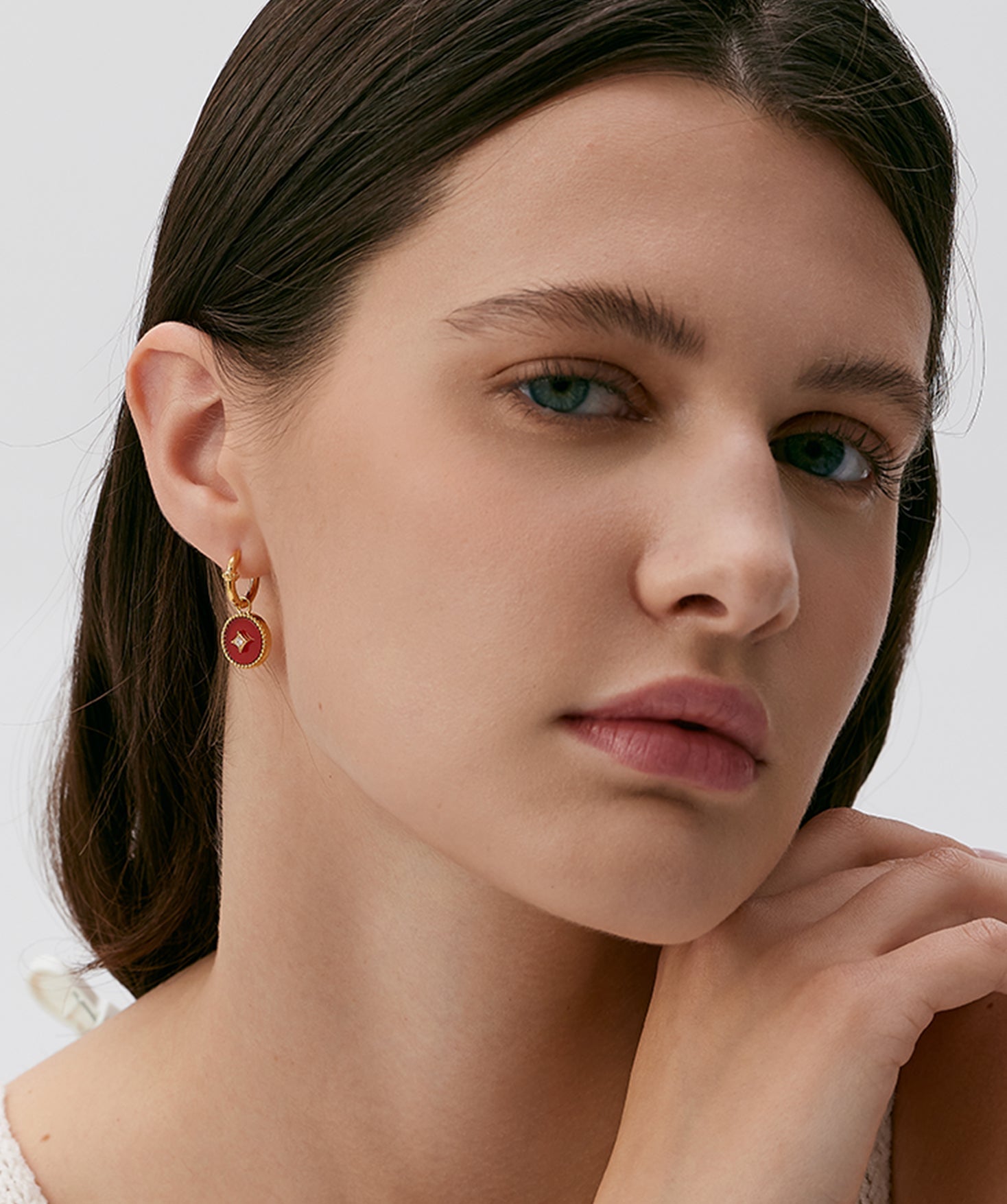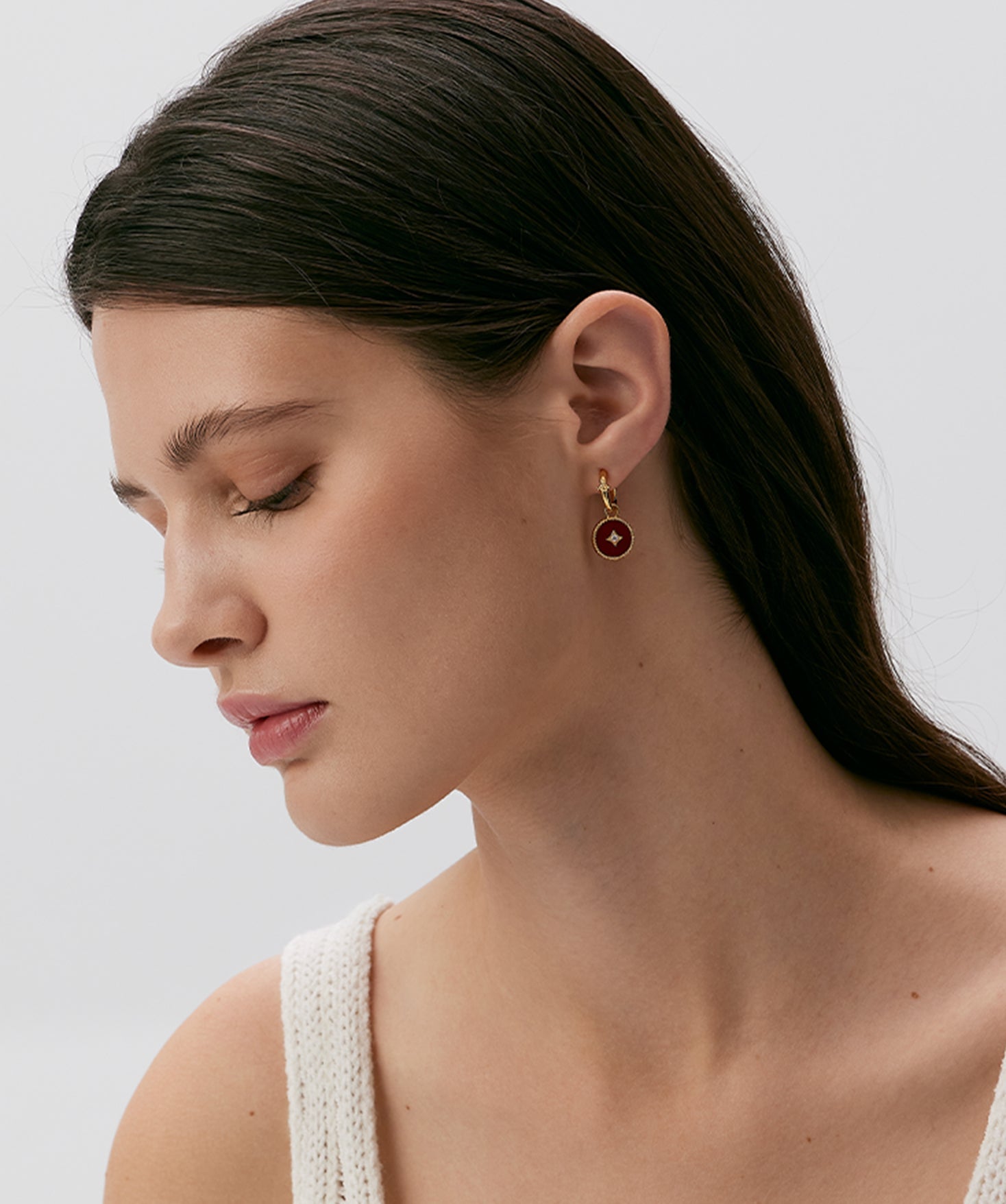 The circular frame recalls the shape of ancient copper coins—where the outer ring signifies wealth, and the inner square, reimagined in a sleek geometric form set with zircon, reflects inner virtues and clarity. A delicate beaded edge traces the hoop, evoking the idea of preserving fortune with grace. The deep red hue of agate radiates warmth and confidence, offering a subtle energy to every movement. With removable gemstone charms, the piece invites personal expression—balancing cultural echoes with modern refinement.