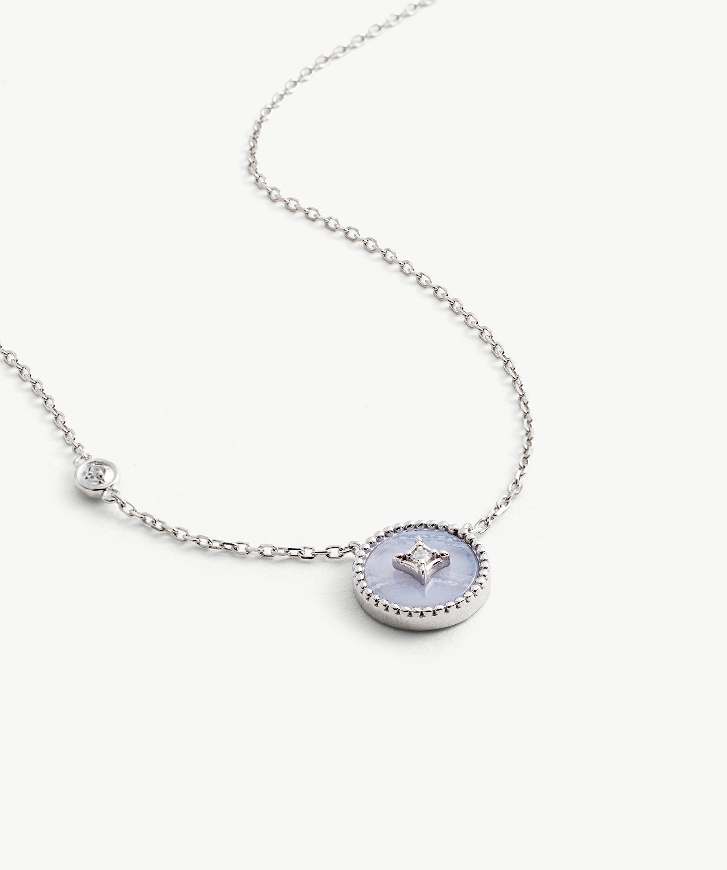 Softly rounded and intentionally restrained, this coin pendant reflects the idea of balance through form. The circular silhouette feels continuous and calm, while the subtle star detail at its center draws the eye inward, creating a quiet focal point. Framed by fine milgrain edges, the blue agate appears gentle and composed, each natural pattern slightly different. Designed to sit close to the skin, the piece feels less like a statement and more like a steady presence — minimal, modern, and quietly grounding.
