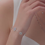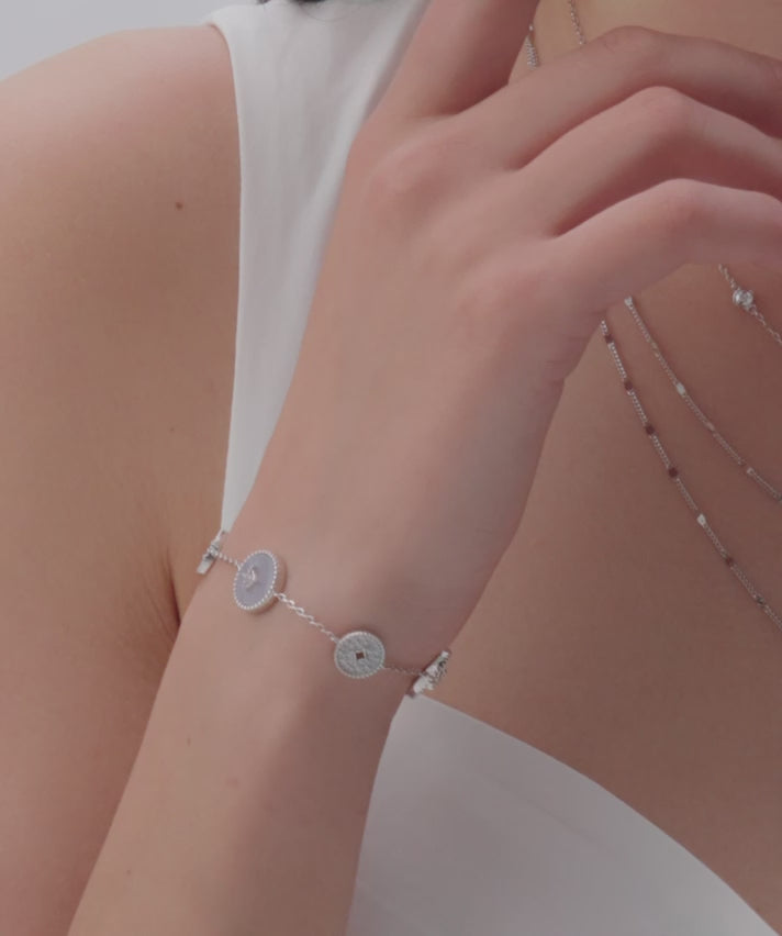 This station bracelet translates the coin motif into a gentle rhythm along the wrist. Alternating Blue Lace Agate discs and pavé-set accents create a sense of balance in motion—soft, measured, and intentional. Framed with delicate milgrain edges and centered by a subtle star, each element reflects the Aura collection’s quiet philosophy: harmony between presence and space. Designed to move with you, it carries a calm strength that feels personal, understated, and timeless.