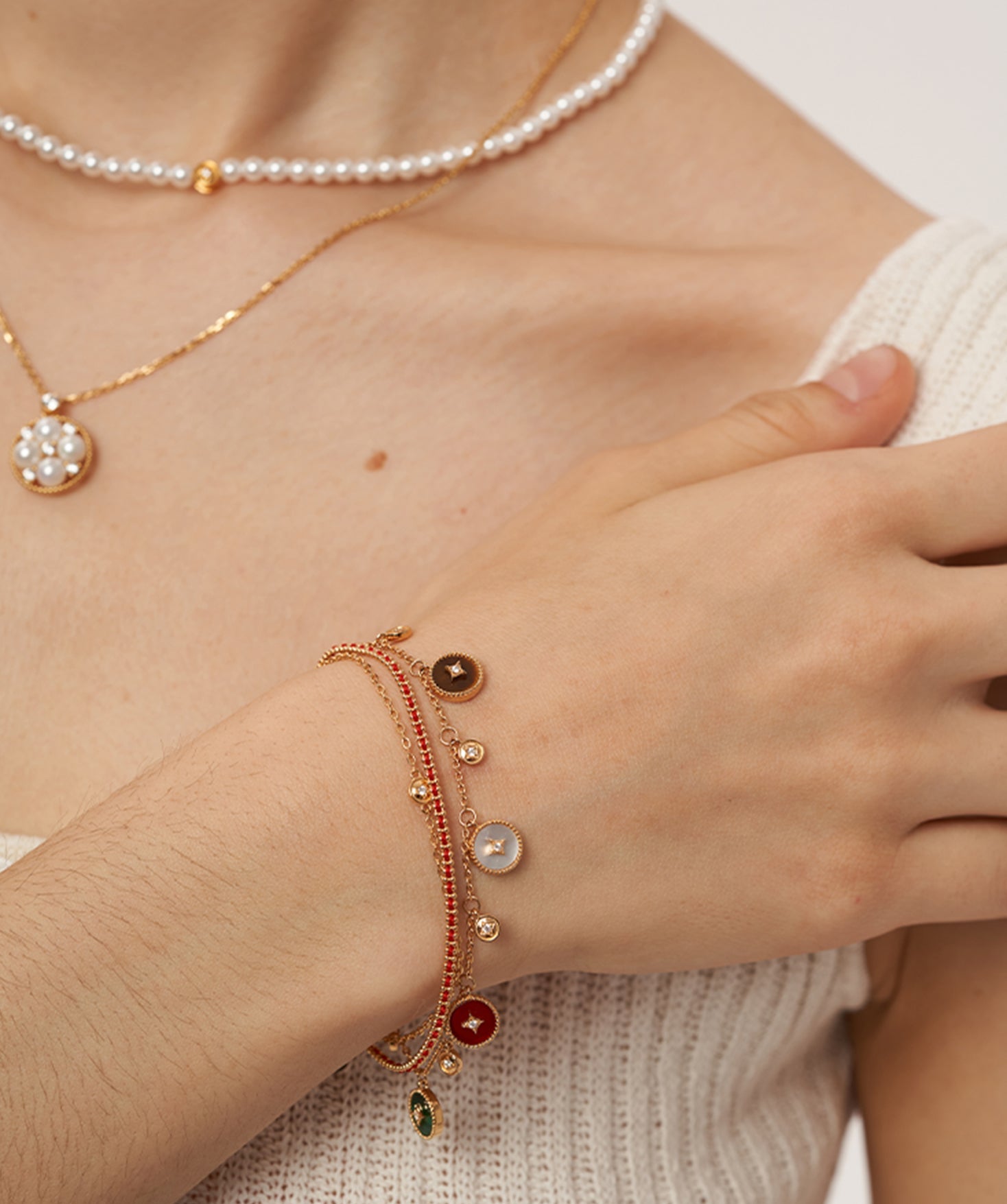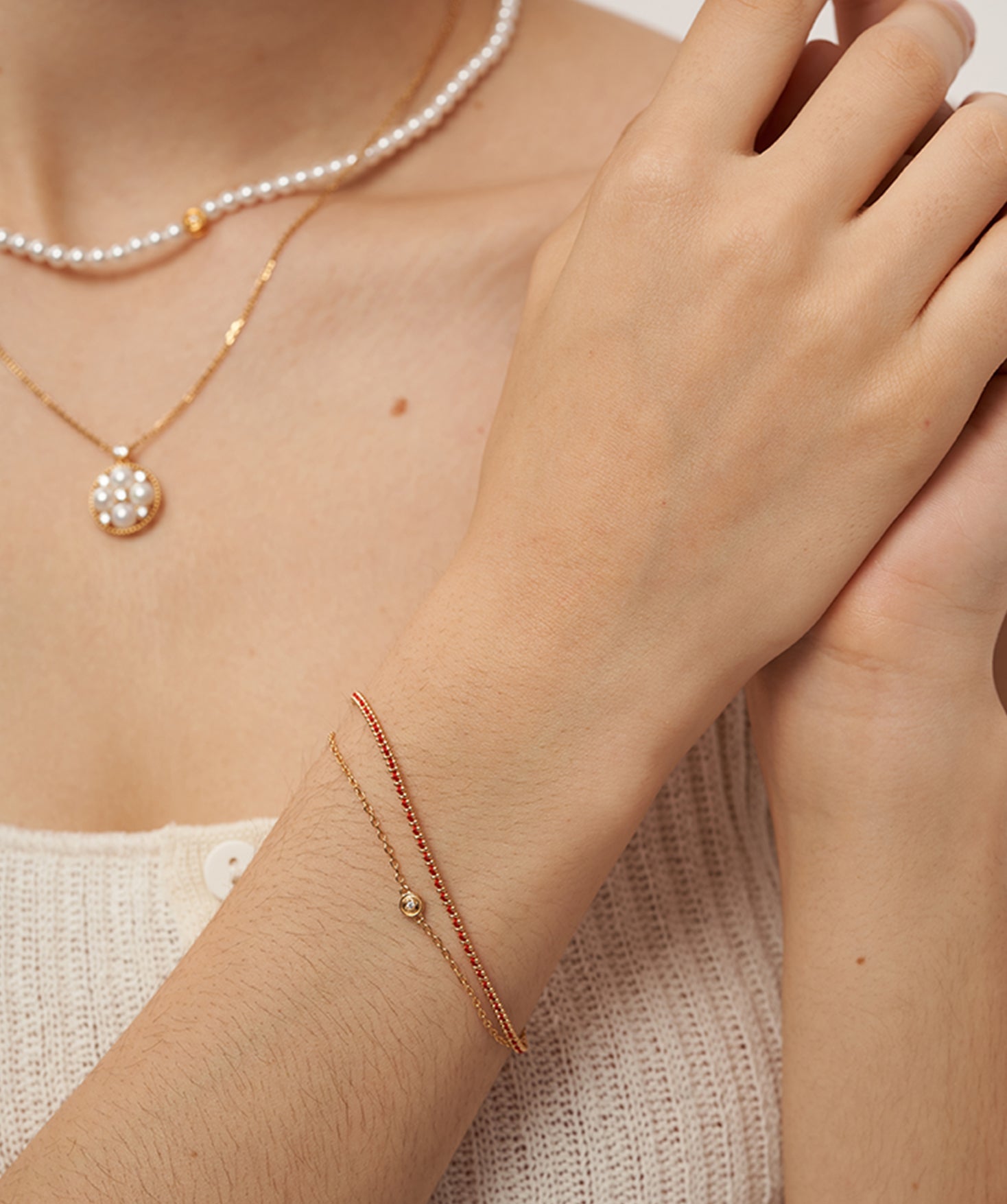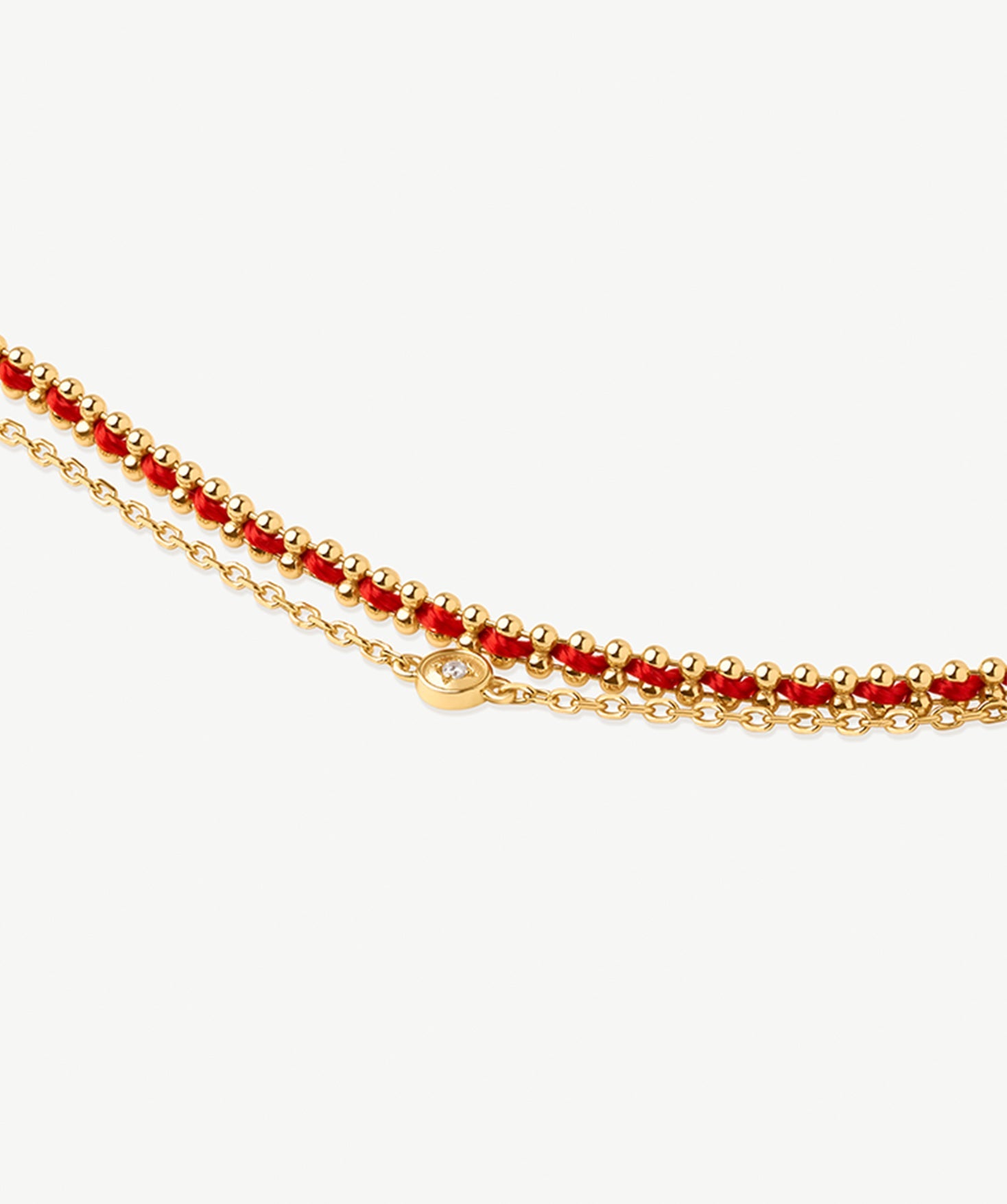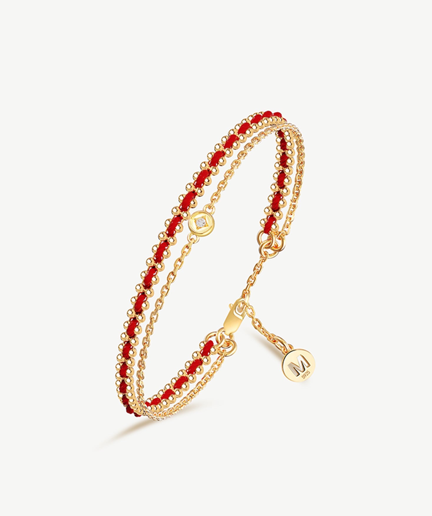 The intertwining of red thread and golden metal in this bracelet adds a handcrafted touch to its modern structure, creating a warm and inviting aesthetic. Paired with a delicate chain adorned with a symbolic coin charm, this bracelet brings together layers of texture and meaning. It’s designed to offer not only beauty but also a sense of protection and luck, evoking the ancient belief in red thread as a guardian and source of good fortune. A piece that carries a meaningful message for those who wear it.