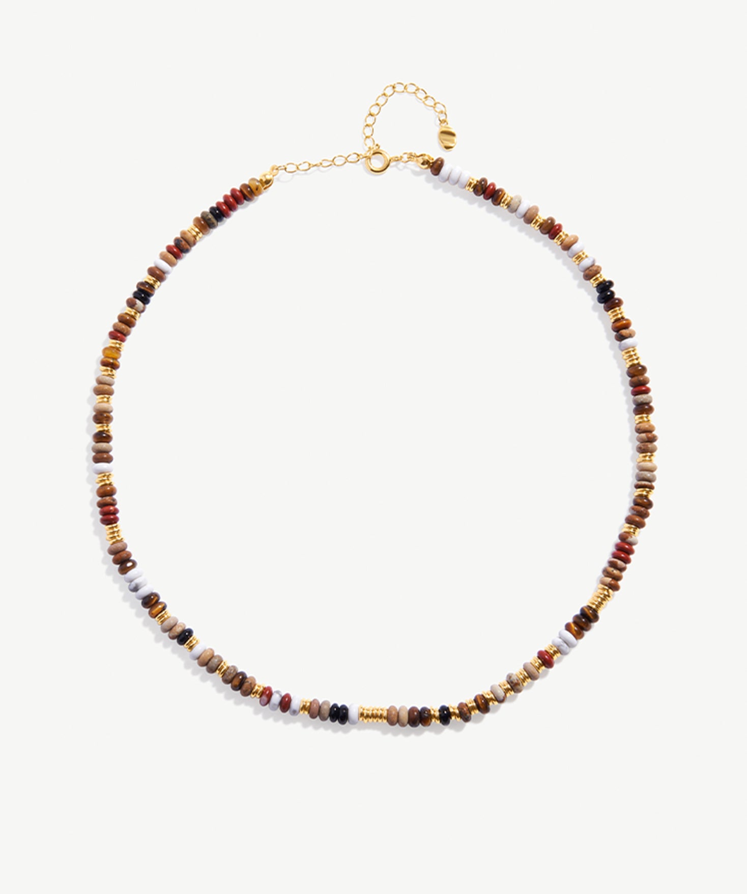 Inspired by the rich colors and textures of natural gemstones, this necklace features a vibrant array of beads including jasper, agate, and tiger's eye, interspersed with luxurious 18K gold plated accents. Each bead is meticulously selected to create a harmonious and eye-catching design. This piece celebrates the beauty of diversity in nature, making it a versatile accessory that adds a touch of uniqueness and elegance to any outfit.
