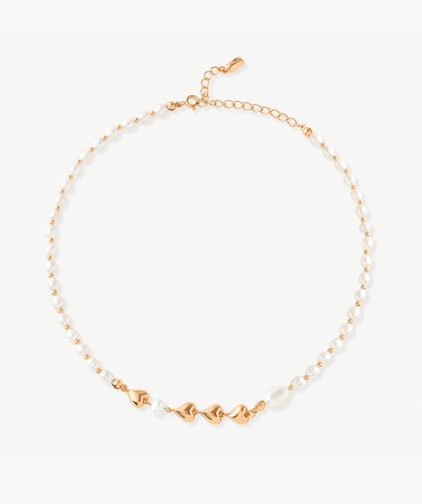 Like frozen moonlight, the pearls in this design radiate a soft glow, each one representing a moment frozen in time. The metal’s geometric curves form a puffed heart, a symbol of love's heartbeat, while the pearls encircle it, embracing the warmth of emotions. This necklace is more than just an accessory—it’s a wearable memory, capturing the quiet moments of love that transcend words. As you wear it, the necklace becomes a constant reminder that love is not always spoken but felt deeply in every touch and glance. The heart and pearls together whisper a tale of eternity, one that remains unbroken.